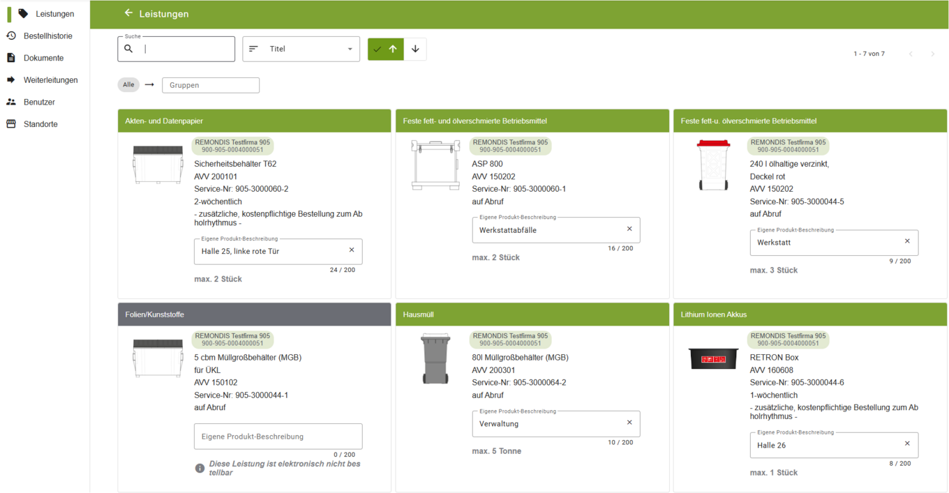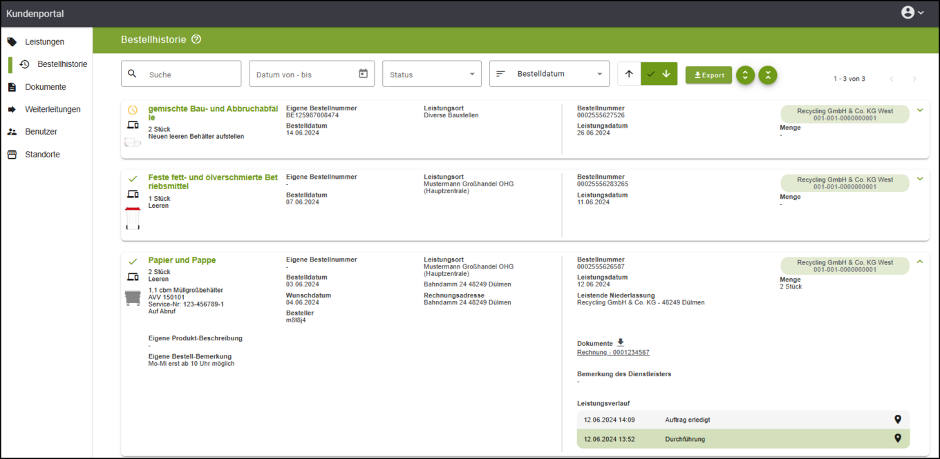 In jeder Bestellung erhalten sie weitere Angaben wie z.B. Leistungsdatum, Angaben zu Dokumentennummern, ggf. Bemerkungen des Dienstleisters und die entsorgte Menge