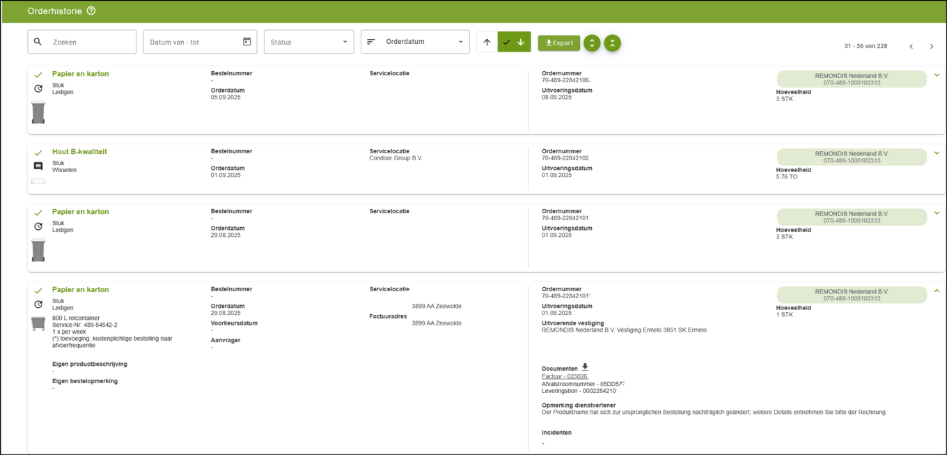 Bij de order staat aanvullende informatie, zoals datum van uitvoering, documentnummers, eventuele opmerkingen van de dienstverlener en de afgevoerde hoeveelheid